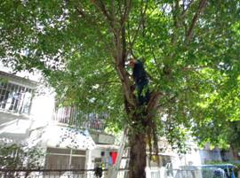 人們都說大樹底下好乘涼,但居住在大榕樹旁的業(yè)主卻到管理處訴說許多困擾——由于樓棟間距小,高大枝繁葉茂的榕樹不但影響他們的通風采光,而且招引蚊蟲,伸進(近)陽臺/窗戶外的樹枝,每當刮風下雨天氣,樹枝就打得陽臺/窗戶咔咔響,存在安全隱患。于是,長期受困憂的業(yè)主到管理處要求給榕樹切枝“美容”,消除困憂。管理處負責人經過走訪部分業(yè)主同意后,安排兩位綠化工到現場實地查看,并制訂切枝可行性方案。在確保業(yè)主安全的前提下,綠化工用鋸子、梯子、繩子等工具,經過艱難的作業(yè),安全地將影響業(yè)主的樹枝修剪或切除。樹枝切除掉落了,困擾業(yè)主的煩心事也解決了。