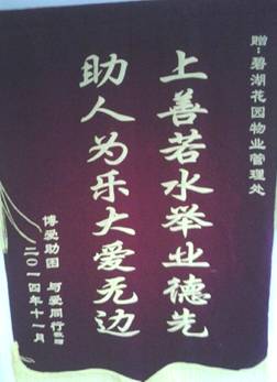 碧湖管理處11月積極響應(yīng)參與“博愛助困,與愛同行”活動(dòng),得到深圳市博愛助困與愛同心愛心公益事業(yè)部的錦旗獎(jiǎng)勵(lì)?;顒?dòng)初始,管理處向小區(qū)業(yè)主大力宣傳,動(dòng)員業(yè)主把家里多余的舊書籍,舊衣服,舊鞋子,床上用品清理出來,捐贈(zèng)給最貧困的山區(qū)【云南,貴州,甘肅】需要的人;活動(dòng)的一周時(shí)間里,管理處在小區(qū)各棟一樓大堂設(shè)置的愛心捐獻(xiàn)收集點(diǎn),方便業(yè)主登記和把捐贈(zèng)的物品放在愛心桶里,平均每天都有四大框捐獻(xiàn)的物品送到舉辦單位。管理處做的不僅僅是捐獻(xiàn)活動(dòng),而是在向小區(qū)廣大業(yè)主倡導(dǎo)“博愛助困,助人為樂”精神文明風(fēng)貌。
