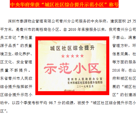 中央華府榮獲“城區(qū)社區(qū)綜合提升示范小區(qū)”稱號(hào)