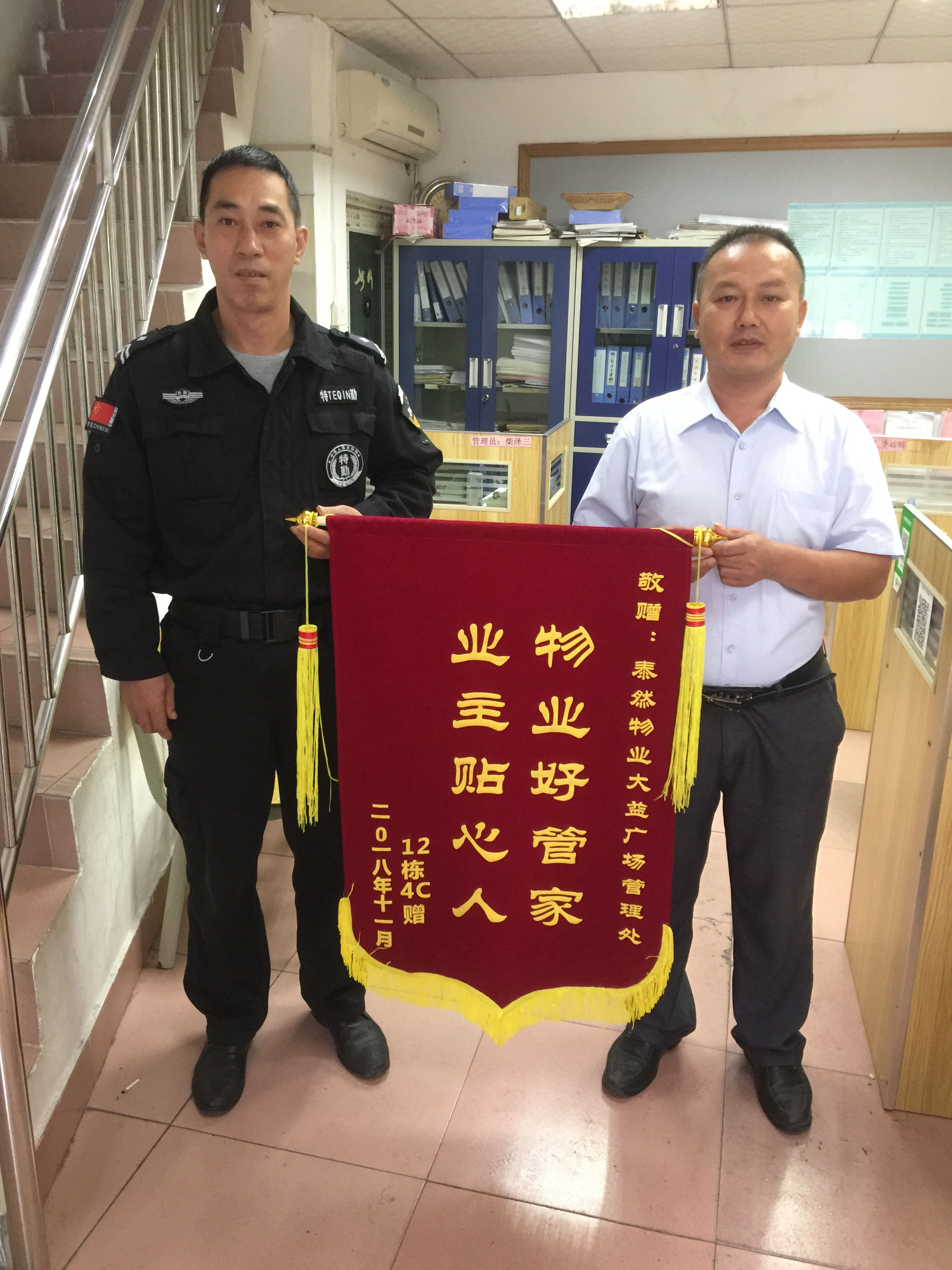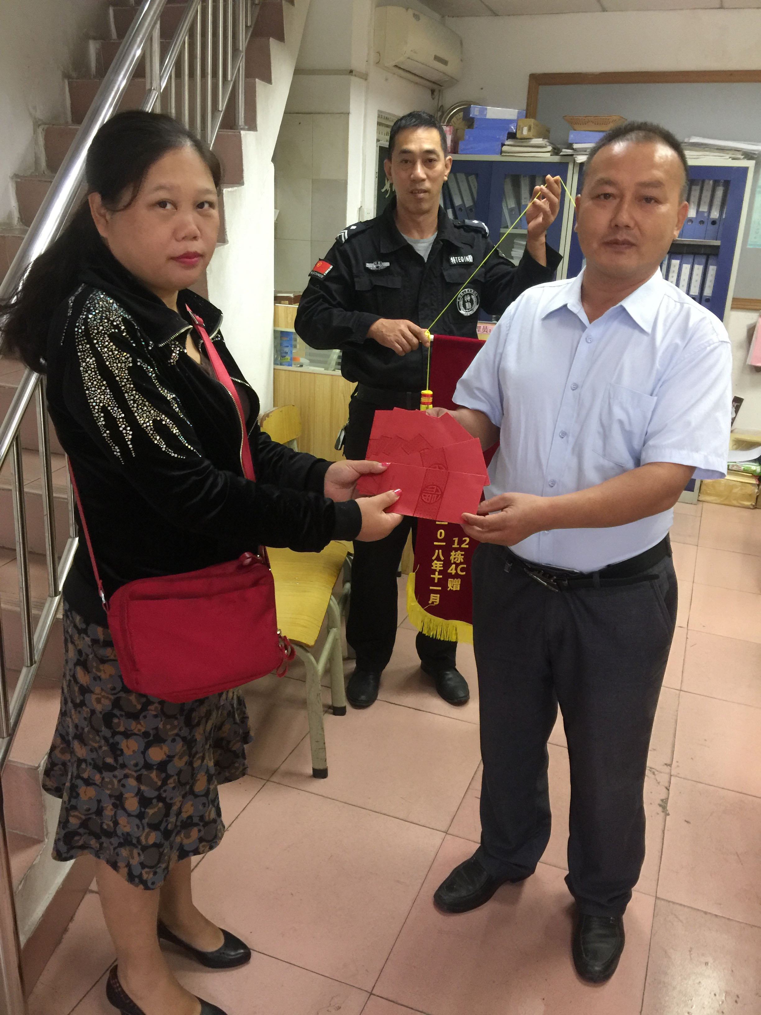 當(dāng)124C業(yè)主收到10000元的協(xié)商賠款時(shí),感激萬(wàn)分。特制作錦旗兩面,分別贈(zèng)送給大益管理處和業(yè)主委員會(huì)。業(yè)主委員會(huì)也為參加抓小偷的柴澤三、王開金、杜賢立、林睦清、汪斌、徐林南分別頒發(fā)了獎(jiǎng)金,給予鼓勵(lì)。
