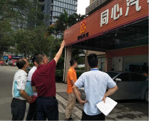 下圖為管理處人員與施工方向商戶宣傳施工時間、搭建防護架維護安全: