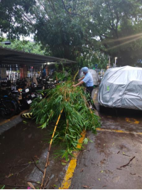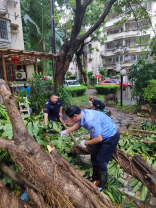 留守管理處值夜班的主任葉昌華、夏隊長,對講機里不時傳來報告:B區(qū)3棟旁一棵樹枝斷了、B區(qū)6棟前斷了一根樹枝、A區(qū)5棟一棵大樹刮倒了.......。臺風“蘇拉”逃離后,葉主任、夏隊長帶領值班的隊員,穿著雨衣、拿著工具趕赴現(xiàn)場,清理阻礙道路通行的樹枝。夜間,雖然溫度較低,風也大,但他們?nèi)员挥晁?、汗水濕透一身,干得歡而帶勁!